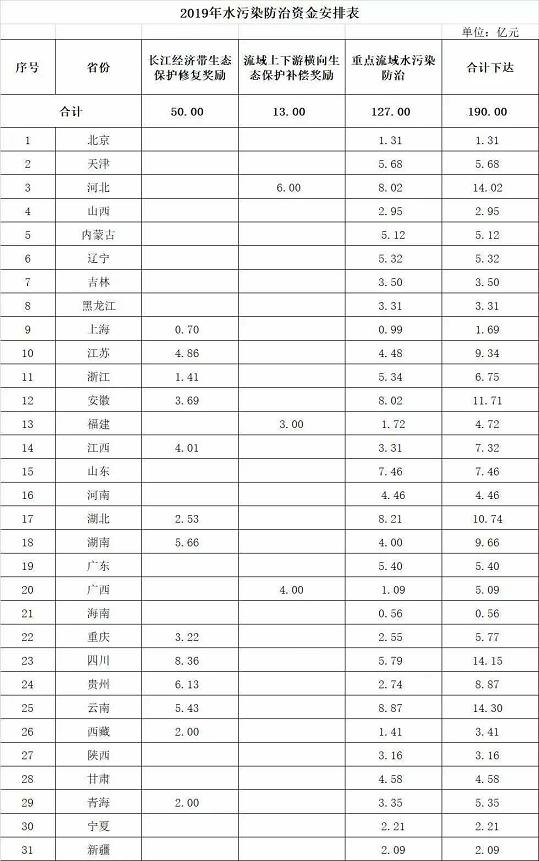 近日,財政部接連發(fā)布《財政部關于下達2019年度大氣污染防治資金預算的通知》、《財政部關于下達2019年度水污染防治資金預算的通知》、《財政部關于下達2019年土壤污染防治專項資金預算的通知》等,下達各省大氣、污水和土壤三項污染防治資金預算,合計490億元。
