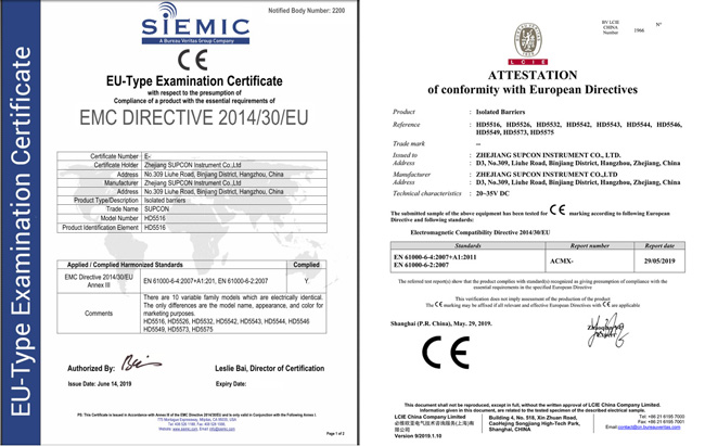 近日,中控HD5500系列安全柵10種子型號(hào)順利通過(guò)權(quán)威第三方認(rèn)證機(jī)構(gòu)(法國(guó)必維集團(tuán)下屬SIEMIC)依據(jù)標(biāo)準(zhǔn)EN 61000-6-4:2007+A1:2011, EN 61000-6-2:2007的審查和測(cè)試,獲得由模式(B+C)級(jí)CE證書,業(yè)界領(lǐng)先。