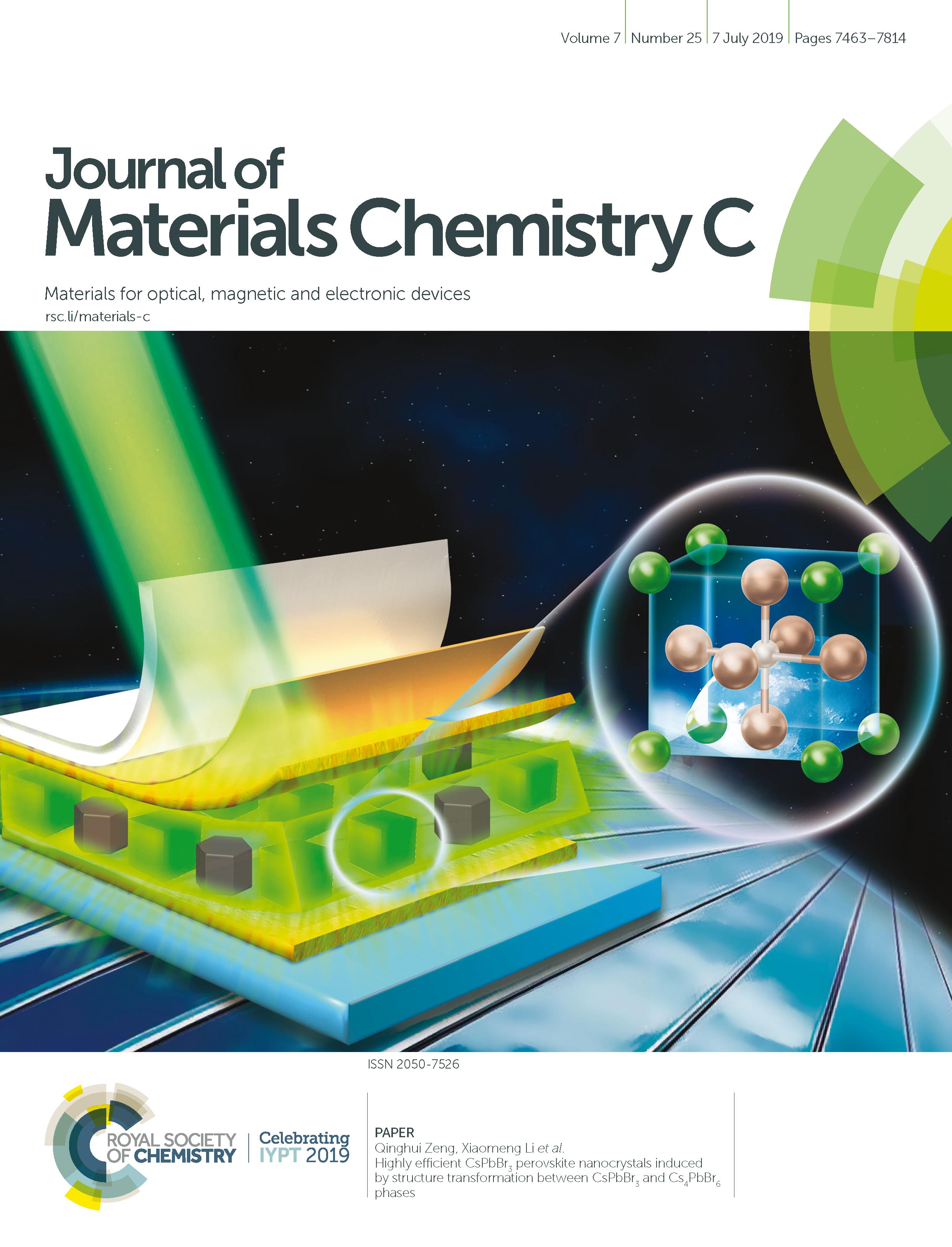 近日,中科院長春光機所曾慶輝副研究員課題組提出一種由于CsPbBr3和Cs4PbBr6的結(jié)構(gòu)轉(zhuǎn)變誘導(dǎo)的高效熒光鈣鈦礦納米晶,所制備的鈣鈦礦納米材料的熒光量子效率可達99%,并將這種高熒光量子產(chǎn)率的材料應(yīng)用于LED器件方面,該工作對于鈣鈦礦量子點在光電器件領(lǐng)域的應(yīng)用具有十分重要的意義。該成果發(fā)表在英國皇家化學(xué)學(xué)會的《Journal of Materials Chemistry C》(SCI影響因子6.641)雜志上(J. Mater. Chem. C, 2019, 7, 7548--7553)?;谠擁椆ぷ鞯某錾芯砍晒浑s志選為首頁封面文章。該文章的第一作者是在讀博士研究生蘇瑩,通訊作者是曾慶輝。