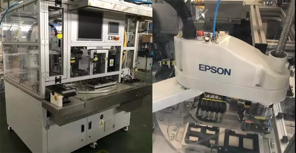 第二站為多工位轉(zhuǎn)臺(tái)形式,包含激光打標(biāo)、機(jī)器人自動(dòng)下料、相機(jī)防錯(cuò)檢測,進(jìn)行多種型號(hào)殼體壓合裝配。