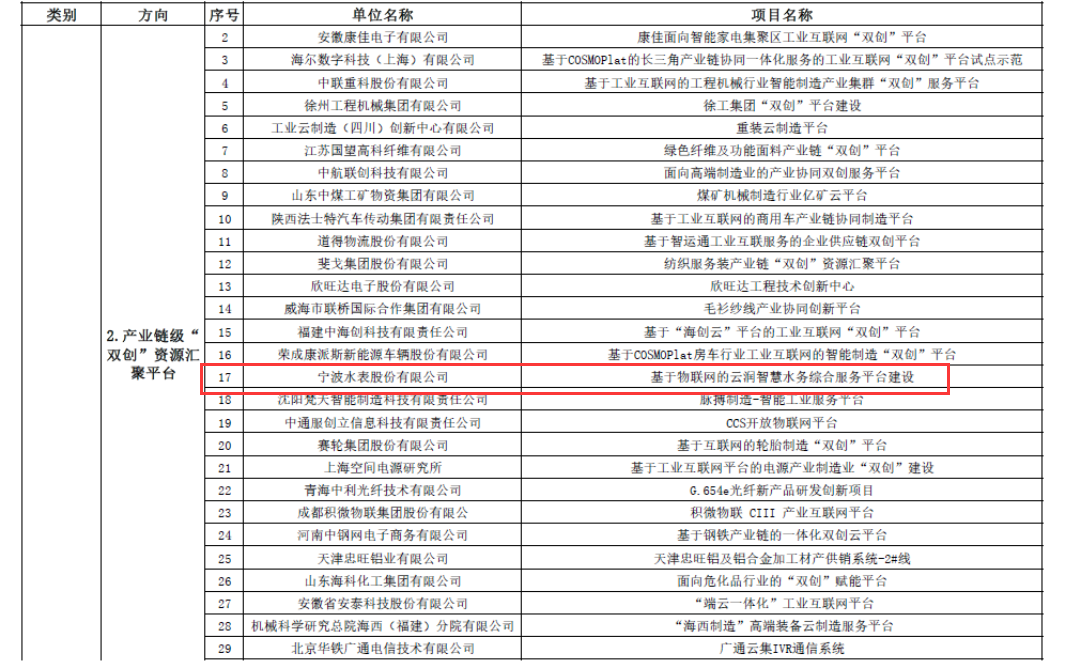 近日,國(guó)家工信部公示了2019年制造業(yè)“雙創(chuàng)”平臺(tái)試點(diǎn)示范項(xiàng)目名單,經(jīng)企業(yè)自主申報(bào)、地方推薦和專家評(píng)審,寧波水表股份有限公司的“基于物聯(lián)網(wǎng)的云潤(rùn)智慧水務(wù)綜合服務(wù)平臺(tái)建設(shè)”被評(píng)為產(chǎn)業(yè)鏈級(jí)“雙創(chuàng)”資源匯聚平臺(tái)方向的試點(diǎn)示范項(xiàng)目,成為此次國(guó)內(nèi)唯一一家面向智慧水務(wù)領(lǐng)域的示范試點(diǎn)項(xiàng)目。