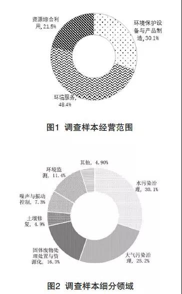 本研究遴選了73家環保企業,對其開展環保企業稅收優惠政策的實施情況進行了問卷調查和走訪座談。從經營范圍來看,73家環保企業中,從事環境保護設備與產品制造、環境服務和資源綜合利用的企業占30.1%、48.4%和21.5%;從細分領域來看,從事水污染治理、大氣污染治理、固體廢物處理處置與資源化、土壤修復、噪聲與振動控制和環境監測細分領域的占比分別為30.1%、25.2%、16.3%、4.9%、7.3%、11.4%及其他4.9%。見圖1、圖2。