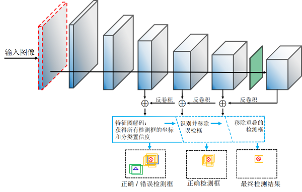 基于深度學(xué)習(xí)的目標(biāo)檢測方法在航拍圖像目標(biāo)檢測中已有相關(guān)研究,但由于航拍圖像的固有特性,既有檢測方法的結(jié)果不佳,存在較多誤檢和漏檢情況?,F(xiàn)有檢測方法多關(guān)注于提高檢測網(wǎng)絡(luò)對目標(biāo)的檢出能力。而該研究則從去除檢測結(jié)果中誤檢目標(biāo)的角度出發(fā),創(chuàng)新性地提出Dual-NMS算法,通過統(tǒng)計各個檢出目標(biāo)周圍生成檢測框的密度和相應(yīng)的分類置信度,實(shí)現(xiàn)自主地去除檢測結(jié)果中的誤檢目標(biāo),大幅提高了檢測結(jié)果精度。在最新的研究中進(jìn)一步將誤檢目標(biāo)的判斷結(jié)果作為網(wǎng)絡(luò)訓(xùn)練的約束項(xiàng),從根本上加強(qiáng)了檢測網(wǎng)絡(luò)提取待檢測目標(biāo)抽象特征的能力。