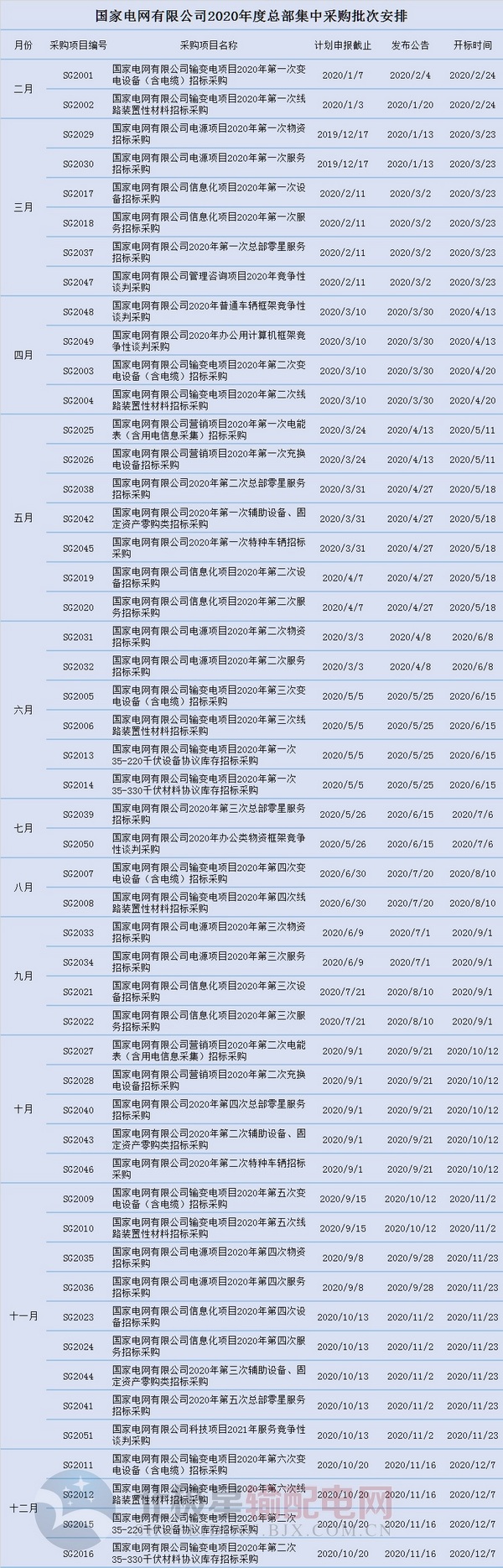 首先比較明顯的一點是2019年12月份未安排有招標(biāo)計劃,最早一批招標(biāo)計劃發(fā)布時間在2月份,為“國家電網(wǎng)有限公司輸變電項目2020年第一次變電設(shè)備(含電纜)招標(biāo)采購”。此外,2020年度招標(biāo)計劃中整個招標(biāo)項目減少了近18個項目,包括了設(shè)計施工監(jiān)理招標(biāo)、電工裝備制造單位生產(chǎn)經(jīng)營性物資競價招標(biāo)、變電站整站招標(biāo)以及信息化單一來源招標(biāo)等。未有變化招標(biāo)項目依然包括了“輸變電項目變電設(shè)備類招標(biāo)”、電能表類招標(biāo)以及信息化設(shè)備和服務(wù)招標(biāo)等。