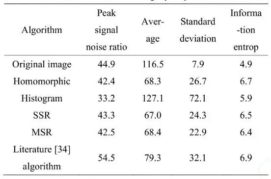 視網(wǎng)膜皮層(Retinex)圖像增強理論是根據(jù)人類視覺特征來展開研究的理論,其原理是通過去除圖像照射分量部分保留反射分量部分,從而獲得圖像本質(zhì)特征,最早是在20世紀(jì)60年代,由學(xué)者Land等人提出。在其原有的基礎(chǔ)理論上,經(jīng)過半世紀(jì)的發(fā)展,改進的Retinex算法被廣泛的運用于各領(lǐng)域。針對Retinex算法在處理圖像存在失真和耗時長等問題,Wang W.、LiB.等人提出了一種快速多尺度Retinex算法,以解決基于多尺度Retinex算法的圖像增強過程中顏色失真的問題,并改進了一種耗時較慢的圖像增強算法的缺點。但此算法在細節(jié)處的處理仍需完善,而Hanumantharaju等人提出了一種基于改進的multiscale Retinex(MSR)算法的新的彩色圖像增強技術(shù),并使用小波能量來評估增強圖像的視覺質(zhì)量。實驗結(jié)果證實了基于小波能量的MSR算法有效地表征了增強圖像的局部和全局細節(jié)。而針對Retinex算法在降噪方面的不足,又有學(xué)者提出基于Retinex和三維塊匹配(block matching 3D)的圖像增強方法。實驗結(jié)果證明,此算法既能很好地表征圖像中的細節(jié),又有效地降低了圖像的噪聲,其結(jié)果與多種算法對比如表2所示。