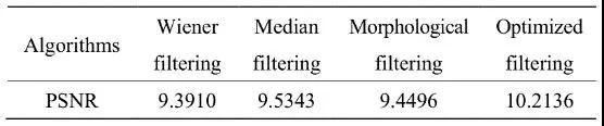劉鑫等人利用基于閾值改進的形態(tài)學(xué)邊緣檢測算法,檢測積水管道的紅外圖像,并與中值濾波、維納濾波、傳統(tǒng)形態(tài)學(xué)等方法處理的圖像作對比,峰值信噪比(peak signal to noise ratio)情況如表5所示。而該方法的圖像分割能力比傳統(tǒng)的Canny、Sobel、Roberts等算子處理效果更好。
