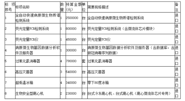 分析測(cè)試百科網(wǎng)訊 近日,寧波市疾病預(yù)防控制中心發(fā)布2020年儀器設(shè)備采購項(xiàng)目的采購公告,需采購一批進(jìn)口儀器設(shè)備,包括全自動(dòng)快速病原微生物質(zhì)譜檢測(cè)系統(tǒng),熒光定量PCR,病原微生物基因數(shù)據(jù)分析軟件,生物安全型離心機(jī)等,采購金額近600萬元。