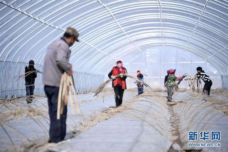 農戶在寧夏銀川市賀蘭縣立崗鎮蘭豐村村集體育苗溫室項目打理秧苗(2月22日攝)。
