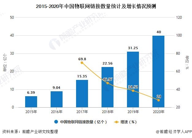 觀察物聯網產業的發展規模最直觀的數據就是“物聯網終端連接數”,從連接數看,據前瞻產業研究院統計數據顯示,2015年我國物聯網鏈接數量為6.39億個,截止至到2017年我國物聯網鏈接數量達到了15.35億個,相比2016年增長了69.8%。初步預計2018年我國物聯網鏈接數量突破20億個,在2019年我國物聯網鏈接數量將達31.25億個,同比增長38.52%。并預測在2020年我國物聯網鏈接數量將達到40億個,相比2017年增長約160%,而且這還是產業視角的保守估計,從物聯網的連接構成看,目前應用最多三個方向為智能硬件、智能家電和智能計量,細分行業中智能家居和智能安防的發展最快,這一切應該與巨頭的推動有關。
