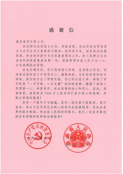 這是中共湖南省委、湖南省人民政府的一封感謝信,信中表達了對威勝集團在疫情期間馳援一線善舉的贊美。