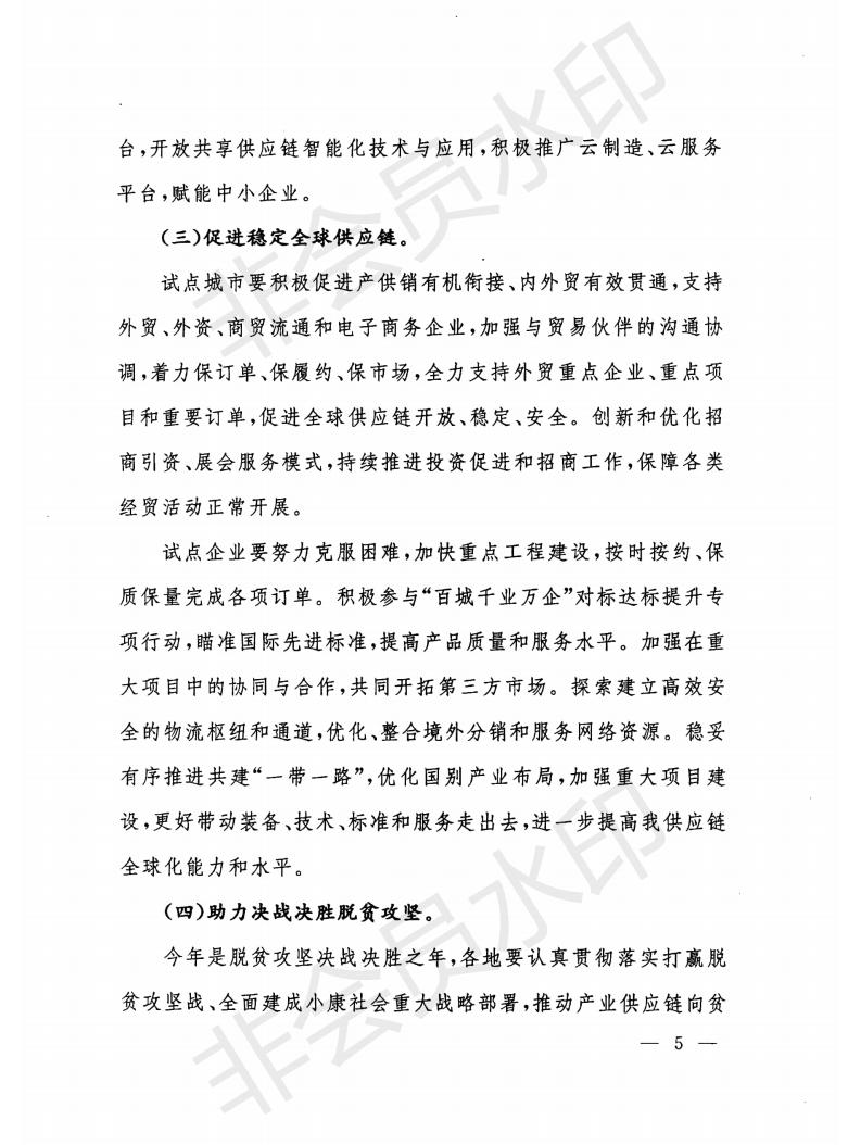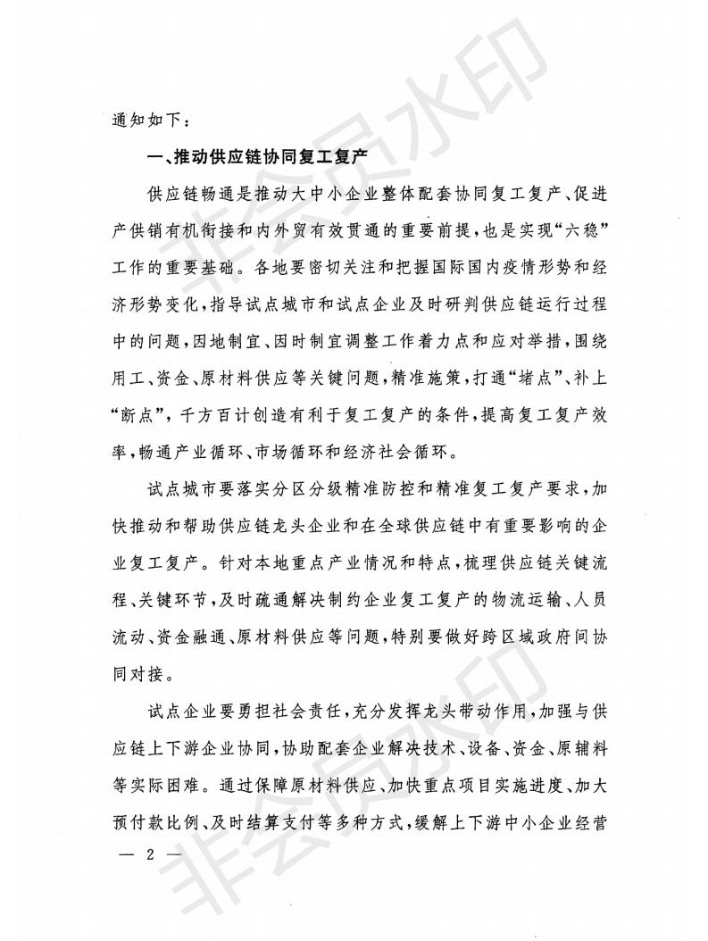 通知要求,試點城市要落實分區分級精準防控和精準復工復產要求,加快推動和幫助供應鏈龍頭企業和在全球供應鏈中有重要影響的企業復工復產;試點企業要勇擔社會責任,充分發揮龍頭帶動作用,加強與供應鏈上下游企業協同,協助配套企業解決技術、設備、資金、原輔料等實際困難。