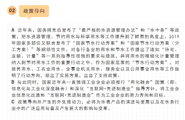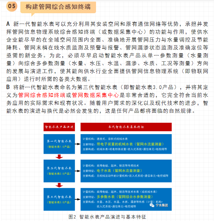 最近,寧水集團已正式啟動新一代智能水表(智能水表3.0)產(chǎn)品及供水新業(yè)務(wù)系統(tǒng)的商用化研發(fā)工作,在原先公司多個博士后課題研究基礎(chǔ)上進行商品化與工程化應(yīng)用研究。可以預期,在不遠將來公司將為供水管網(wǎng)系統(tǒng)提供高性價比的水務(wù)綜合大數(shù)據(jù),為管網(wǎng)現(xiàn)代化管理提供信息來源與決策依據(jù)(這方面詳細內(nèi)容可參見附錄:“水表產(chǎn)品演進之路——從智能水表1.0/2.0產(chǎn)品向智能水表3.0產(chǎn)品邁進”一文)。至2020年初,公司在與浙江大學控制科學與工程學院合作基礎(chǔ)上,又先后與同濟大學環(huán)境科學與工程學院、寧波大學信息科學與工程學院等高校共同簽訂戰(zhàn)略合作協(xié)議,并聯(lián)合成立了“水務(wù)新技術(shù)研發(fā)實驗室”和“水務(wù)信息感知研發(fā)實驗室”,并將與寧波工業(yè)互聯(lián)網(wǎng)研究院等科研機構(gòu)就水務(wù)新型傳感技術(shù)、供水關(guān)鍵核心業(yè)務(wù)等的解決方案展開合作研究。