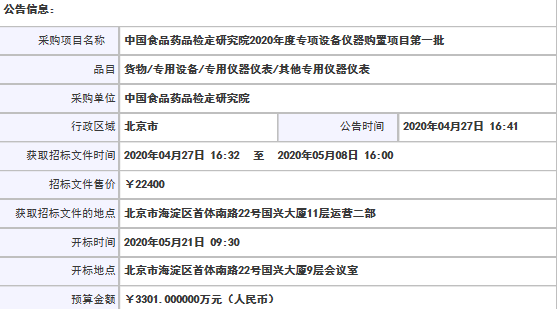 近30年來,中檢院通過實(shí)施“人才興檢”和“科技強(qiáng)檢”的戰(zhàn)略,開創(chuàng)了許多科技成果。面向未來,中檢院還將堅(jiān)持發(fā)揮為國把關(guān)、為民負(fù)責(zé)的重要作用,以檢驗(yàn)檢測能力建設(shè)為核心,努力譜寫新時(shí)代藥品檢驗(yàn)檢測事業(yè)的新篇章。為此,中檢院決定采購一批科學(xué)儀器助陣,特委托國信國采(北京)招標(biāo)咨詢有限責(zé)任公司,根據(jù)《中華人民共和國政府采購法》等有關(guān)規(guī)定,對(duì)中國食品藥品檢定研究院2020年度專項(xiàng)設(shè)備儀器購置項(xiàng)目第一批進(jìn)行公開招標(biāo)。公告發(fā)布于中國政府采購網(wǎng)。