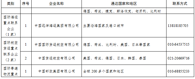 按照國務(wù)院部署要求,工業(yè)和信息化部配合交通運(yùn)輸部、外交部、商務(wù)部等部門,在國務(wù)院復(fù)工復(fù)產(chǎn)推進(jìn)工作機(jī)制下成立了國際物流工作專班,協(xié)調(diào)解決當(dāng)前疫情期間制造業(yè)國際物流中存在的問題。近日,國際物流工作專班公布第一批國際物流運(yùn)輸重點(diǎn)聯(lián)系企業(yè)名單,其中綜合物流企業(yè)4家、中歐班列運(yùn)營企業(yè)10家、國際航運(yùn)企業(yè)1家、國際航空貨運(yùn)企業(yè)2家、國際寄遞物流企業(yè)2家、國際道路運(yùn)輸企業(yè)35家。