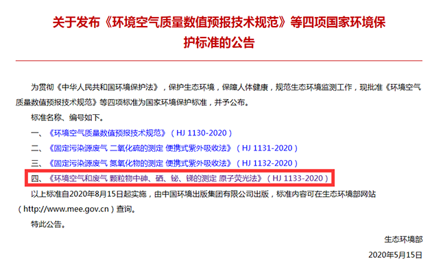 為貫徹《中華人民共和國環(huán)境保護(hù)法》和《中華人民共和國大氣污染防治法》,進(jìn)一步完善國家生態(tài)環(huán)境保護(hù)標(biāo)準(zhǔn)體系,近日,生態(tài)環(huán)境部發(fā)布四項(xiàng)國家生態(tài)環(huán)境保護(hù)標(biāo)準(zhǔn),其中《環(huán)境空氣和廢氣 顆粒物中砷、硒、 鉍、銻的測定 原子熒光法》(HJ 1133-2020),規(guī)范了環(huán)境空氣和廢氣顆粒物中砷、硒、鉍、銻的測定方法。該標(biāo)準(zhǔn)為首次發(fā)布,自2020年8月15日起實(shí)施。