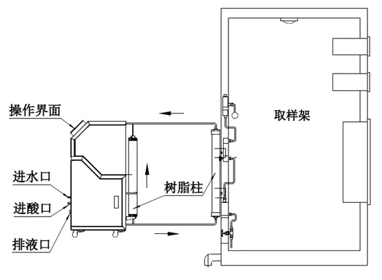 取樣架上發生樹脂失效時,運行管路直接連接到備用柱上,保證系統運行取樣的連續不間斷;空出的失效樹脂柱與再生裝置連接,啟動再生升系統,等待系統完成再生即可更換到主用樹脂柱上繼續運行取樣。