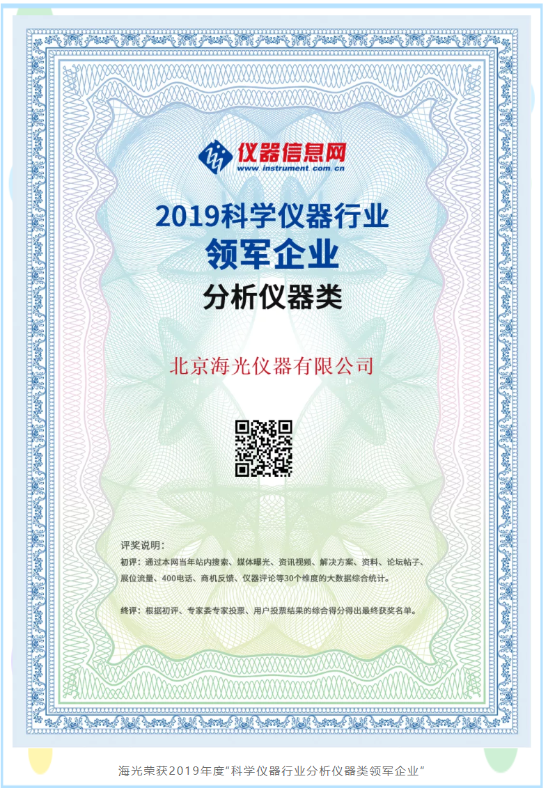 北京海光儀器有限公司是中國儀器儀表行業協會常務理事單位,主要從事分析儀器的研發、制造、銷售和售后服務, 是中國知名的光譜分析儀器制造廠商,連續十二年被媒體評為“最具影響力國內儀器廠商”稱號,公司通過了質量管理體系、環境管理體系、職業健康安全體系三大體系認證,公司以原子熒光光度計、原子吸收分光光度計、測汞儀、流動分析儀、快速溶劑萃取儀和等離子體發射光譜儀等分析儀器為主要產品,廣泛應用于食品藥品、環境監測、農業、質監、自來水、檢驗檢疫、地質、第三方檢測、科研等領域,產品獲得國家科技進步三等獎、七次BCEIA 金獎、自主創新金獎、國產好儀器等多種獎項。日前,2019年度“科學儀器行業領軍企業”(原“最具影響力廠商”)評選活動獲獎名單揭曉,北京海光儀器有限公司獲分析儀器類領軍企業稱號,也是連續十三年獲此殊榮。
