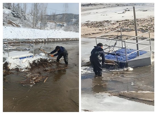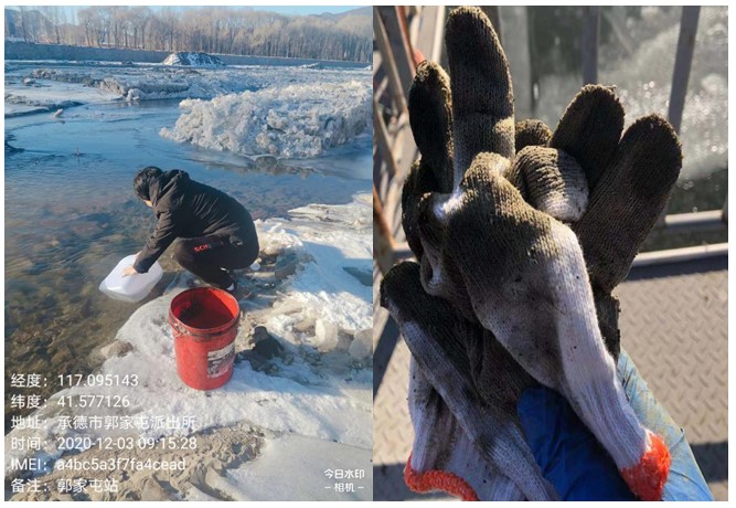 河北省承德市郭家屯、李臺站運維人員黃可新、高凌立對水站進行巡檢時,發(fā)現(xiàn)采水口附近堆積了大量樹枝雜物,他們毫不猶豫,穿著水褲下入河水,刨開冰雪清理雜物。雖然腳下的河水冰冷,但是他們的熱情高漲,保證數(shù)據(jù)“真、準、全”,他們認為一切都是值得的。