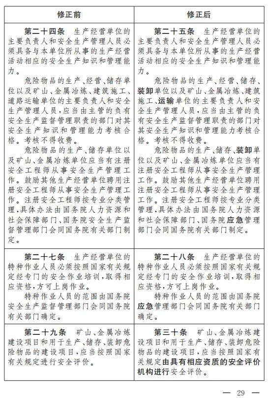 九、將第二十九條改為第三十條,修改為:“礦山、金屬冶煉建設項目和用于生產、儲存、裝卸危險物品的建設項目,應當按照國家有關規定由具有相應資質的安全評價機構進行安全評價。”