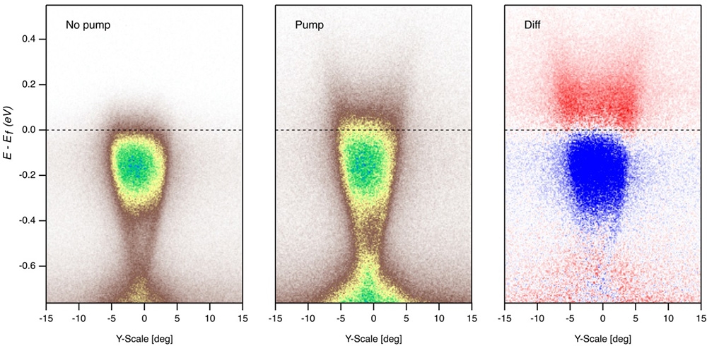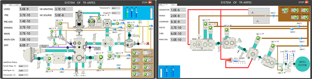 近日,中國科學院物理研究所/北京凝聚態物理國家研究中心極端條件物理重點實驗室丁洪研究組(EX7組)的博士生陳發民、潘默君、劉俊德在錢天研究員和運晨霞副主任工程師的指導下,研制成功國內首臺基于高重復頻率、高通量高次諧波光源的超快角分辨光電子能譜儀(HHG-TRARPES),并通過了專家的現場測試(圖1)。該儀器系統配備了六軸低溫樣品臺,DA30半球分析器,極限真空優于10-10torr,最低溫度小于6K,其光子能量連續可調(20-60eV),重復頻率為0.4MHz。第18階次光子(21.6eV)的能量分辨率為109meV,時間分辨率為120fs,樣品位置處的光通量約為1011ph/s,綜合參數達到世界同類型設備的一流水平。此外,全設備接入自主開發的控制系統,實現了集成化、智能化、便捷化操作,時間和角度聯動掃譜,內置真空自鎖與保護功能。目前實驗裝置已經進入穩定運行階段,實現了對拓撲絕緣體Bi2Se3未占據態和電荷密度波材料1T-TiSe2能帶動力學演化過程的測量(圖2和圖3)。這一設備的搭建完成,填補了國內相關領域的空白,為未來研究量子材料中電子的超快動力學過程、未占據態以及新型電子態提供了關鍵的實驗平臺。