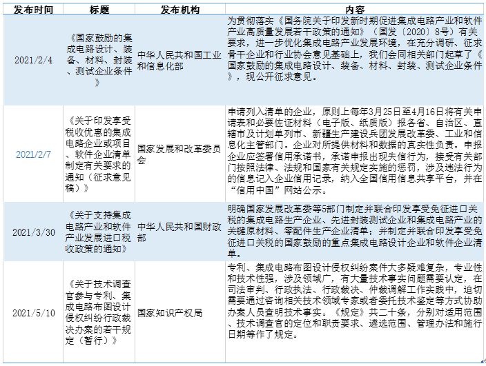2021年1-8月國(guó)家針對(duì)集成電路產(chǎn)業(yè)出臺(tái)的政策主要集中在稅收、知識(shí)產(chǎn)權(quán)保護(hù)及推動(dòng)產(chǎn)業(yè)發(fā)展等方面,其中稅收優(yōu)惠政策是該階段的主題,2021年2月國(guó)家發(fā)展和改革委員會(huì)發(fā)布了《關(guān)于印發(fā)享受稅收優(yōu)惠的集成電路企業(yè)或項(xiàng)目、軟件企業(yè)清單制定有關(guān)要求的通知(征求意見(jiàn)稿)》,隨后在3月份財(cái)政部等5部門聯(lián)合發(fā)布《關(guān)于支持集成電路產(chǎn)業(yè)和軟件產(chǎn)業(yè)發(fā)展進(jìn)口稅收政策的通知》,這些政策規(guī)定了集成電路行業(yè)享受稅收優(yōu)惠條件和需履行的義務(wù)。除此之外,國(guó)家知識(shí)產(chǎn)權(quán)局發(fā)布了《關(guān)于技術(shù)調(diào)查官參與專利、集成電路布圖設(shè)計(jì)侵權(quán)糾紛行政裁決辦案的若干規(guī)定(暫行)》以期能夠解決專利、集成電路布圖設(shè)計(jì)侵權(quán)糾紛問(wèn)題。從發(fā)布的政策看,目前有關(guān)部門對(duì)于支持集成電路產(chǎn)業(yè)的發(fā)展多管齊下,從稅收優(yōu)惠、知識(shí)產(chǎn)權(quán)保護(hù)等方面優(yōu)化產(chǎn)業(yè)發(fā)展環(huán)境,推動(dòng)產(chǎn)業(yè)發(fā)展。