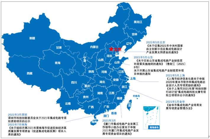 為推動(dòng)集成電路產(chǎn)業(yè)快速發(fā)展,多地針對(duì)集成電路重點(diǎn)科技人員和項(xiàng)目出臺(tái)了獎(jiǎng)勵(lì)和資金支持政策,2021年5月山東省發(fā)布了《關(guān)于印發(fā)山東省集成電路產(chǎn)業(yè)財(cái)政獎(jiǎng)補(bǔ)政策實(shí)施細(xì)則的通知》及《關(guān)于開(kāi)展山東省集成電路產(chǎn)業(yè)財(cái)政獎(jiǎng)補(bǔ)項(xiàng)申報(bào)的通知》兩份文件,文件中對(duì)于實(shí)施細(xì)則和相關(guān)要求做了詳細(xì)的說(shuō)明,除山東省之外,北京、上海、深圳、廈門、珠海、金華等地均有文件對(duì)項(xiàng)目支持資金相關(guān)領(lǐng)域進(jìn)行詳細(xì)的規(guī)范。