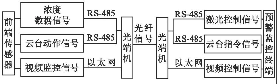 數據傳輸系統負責前端激光氣體傳感器與后端預警監控終端之間信號的傳輸。其中前端傳感器向后端傳輸的信號為:激光檢測模塊的濃度數據信號;三維旋轉云臺實時返回的云臺動作信號;視頻監控模塊采集的工藝現場視頻信號。預警監控終端通過向前端傳感器發送指令信號控制傳感器的運行。