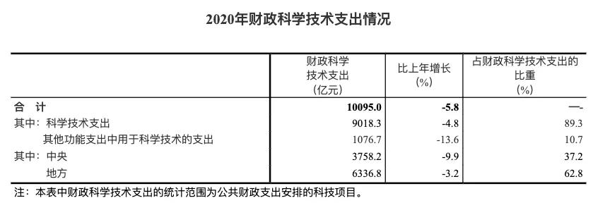 2020年國家財政科技支出出現下降,為10095.0億元,比上年減少622.4億元,下降5.8%。其中,中央財政科技支出下降9.9%,地方財政科技支出下降3.2%。