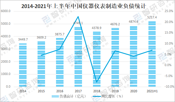 2014-2021年上半年中國儀器儀表制造業負債統計