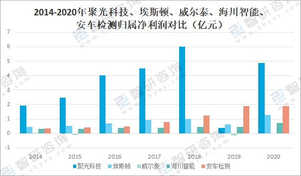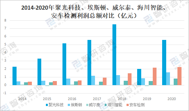 2014-2020年聚光科技、埃斯頓、威爾泰、海川智能、安車檢測利潤總額對比(億元)