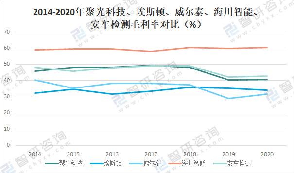 2014-2020年聚光科技、埃斯頓、威爾泰、海川智能、安車檢測毛利率對比(%)