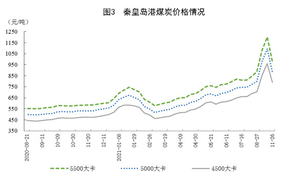 11月26日,秦皇島港5500大卡、5000大卡和4500大卡動力煤綜合交易價格分別為每噸986元、891元和792元,比10月29日分別回落216元、205元和169元。