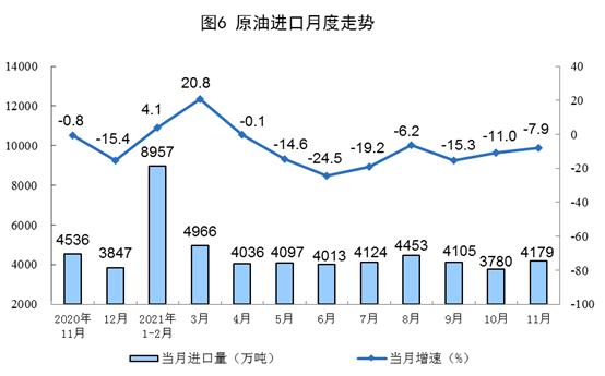 1—11月份,生產原油18248萬噸,同比增長2.5%,比2019年同期增長4.2%,兩年平均增長2.1%;加工原油64479萬噸,同比增長4.9%,比2019年同期增長8.2%,兩年平均增長4.0%。