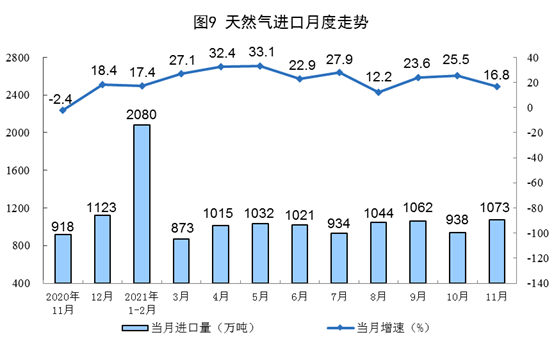 天然氣進口有所放緩。11月份,進口天然氣1073萬噸,同比增長16.8%,增速比上月放緩8.7個百分點。1—11月份,進口天然氣10976萬噸,同比增長21.8%。