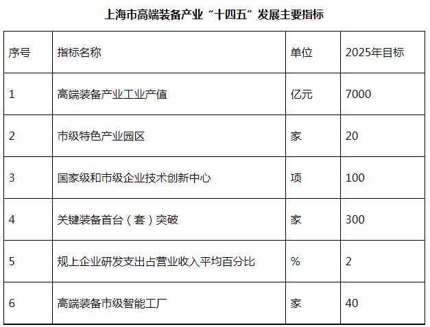 為全力推動高端裝備產業高質量發展,上海近期發布《上海市高端裝備產業發展“十四五”規劃》,提出到2025年,初步建成具有全球影響力的高端裝備創新增長極與核心技術策源地。產業規模突破7000億元,市級特色產業園區數達到20家以上;建設國家和市級企業技術創新中心100個,實現關鍵裝備與核心部件首臺(套)突破300項;新興技術與高端裝備融合程度進一步加深,建設高端裝備市級智能工廠40家以上。