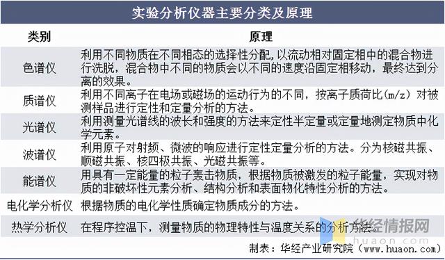 實(shí)驗(yàn)分析儀器是用于測定物質(zhì)的組成、結(jié)構(gòu)等特性的儀器。實(shí)驗(yàn)分析儀器主要包括色譜儀、質(zhì)譜儀、光譜儀、波譜儀、能譜儀、電化學(xué)分析儀、熱學(xué)分析儀等。其中光譜儀、質(zhì)譜儀、色譜儀和實(shí)驗(yàn)室設(shè)備是其最重要的產(chǎn)品分支。