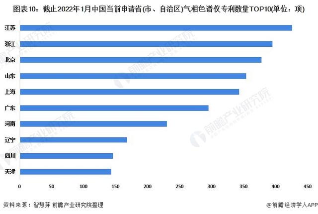 中國方面,江蘇省為中國當前申請氣相色譜儀專利數量最多的省份,累計當前氣相色譜儀專利申請數量高達425項。浙江、北京、山東、上海當前申請氣相色譜儀專利數量均超過300項。中國當前申請省(市、自治區)氣相色譜儀專利數量排名前十的省份還有河南、遼寧、四川和天津。