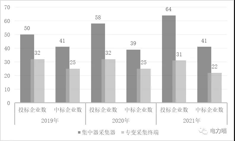 在國網集中器采集器市場,近三年共有70家企業參與競爭,共有45家企業有中標記錄。在國網專變采集終端市場,近三年共有37家企業參與競爭,共有27家企業有中標記錄。