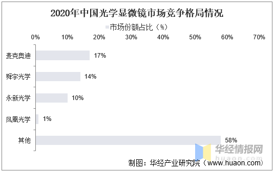 目前,國內具備生產高端顯微鏡能力的企業主要是舜字光學科技、麥克奧迪、永新光學等企業,而高端顯微鏡中如系統顯微鏡、共聚焦掃描和超分辨顯微鏡等主要集中在徠卡顯微系統、蔡司、尼康、奧林巴斯等國外企業。據統計,2020年,在國內品牌中,市場份額排名靠前的是麥克奧迪、舜宇光學科技和永新光學。此外,廣州晶華光學在光學儀器領域的占有率也較高,2019年公司光學儀器收入達5.25億元。