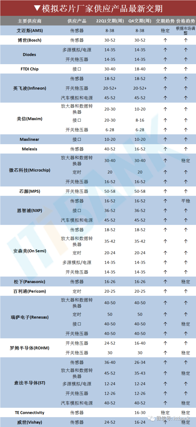 此外,英飛凌的汽車(chē)MCU交期也繼續(xù)拉長(zhǎng),今年第一季度的交期為配貨狀態(tài);模擬芯片的交期最長(zhǎng)為52周以上,最短也要18周,其中汽車(chē)模擬芯片45-52周。有媒體表示,英飛凌的這一通知函或?qū)⒁l(fā)芯片市場(chǎng)的新一輪漲價(jià)潮。