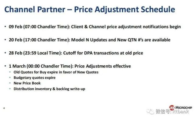 文件表示,Microchip將于3月1日開(kāi)始漲價(jià),并讓代理商一起告知終端客戶(hù)們,屆時(shí)新訂單、庫(kù)存和積壓訂單都將根據(jù)漲價(jià)后的價(jià)格交易。