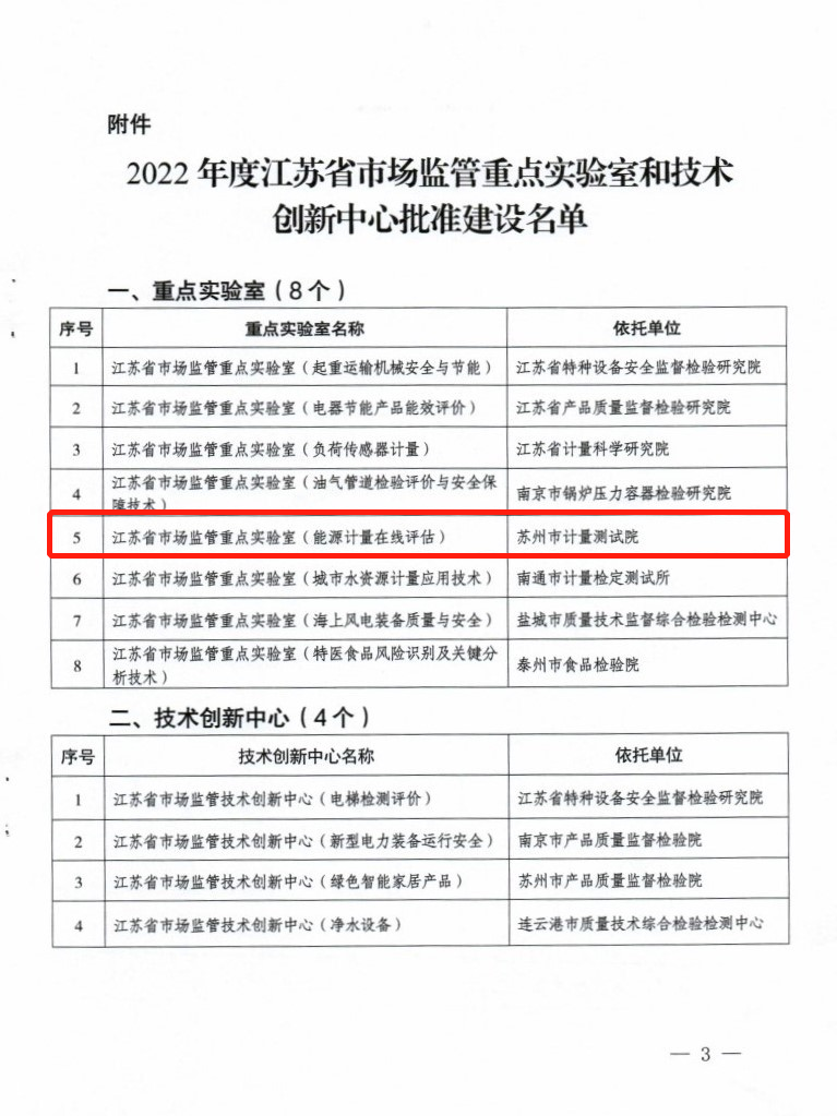 近日,江蘇省市場監督管理局發文《省市場監管局關于批準建設2022年度省市場監管重點實驗室和技術創新中心的通知》(蘇市監科信﹝2022﹞337號),蘇州計量院申報的江蘇省市場監管重點實驗室(能源計量在線評估)獲批建設。