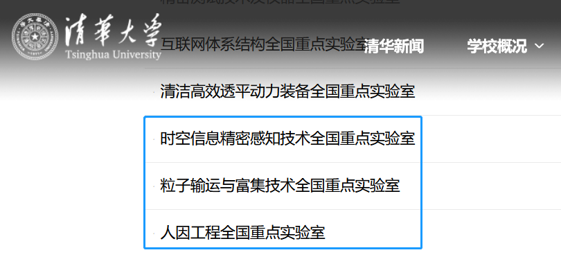 清華大學官網更新信息新增“時空信息精密感知技術全國重點實驗室”、“粒子輸運與富集技術全國重點實驗室”、“人因工程全國重點實驗室”。