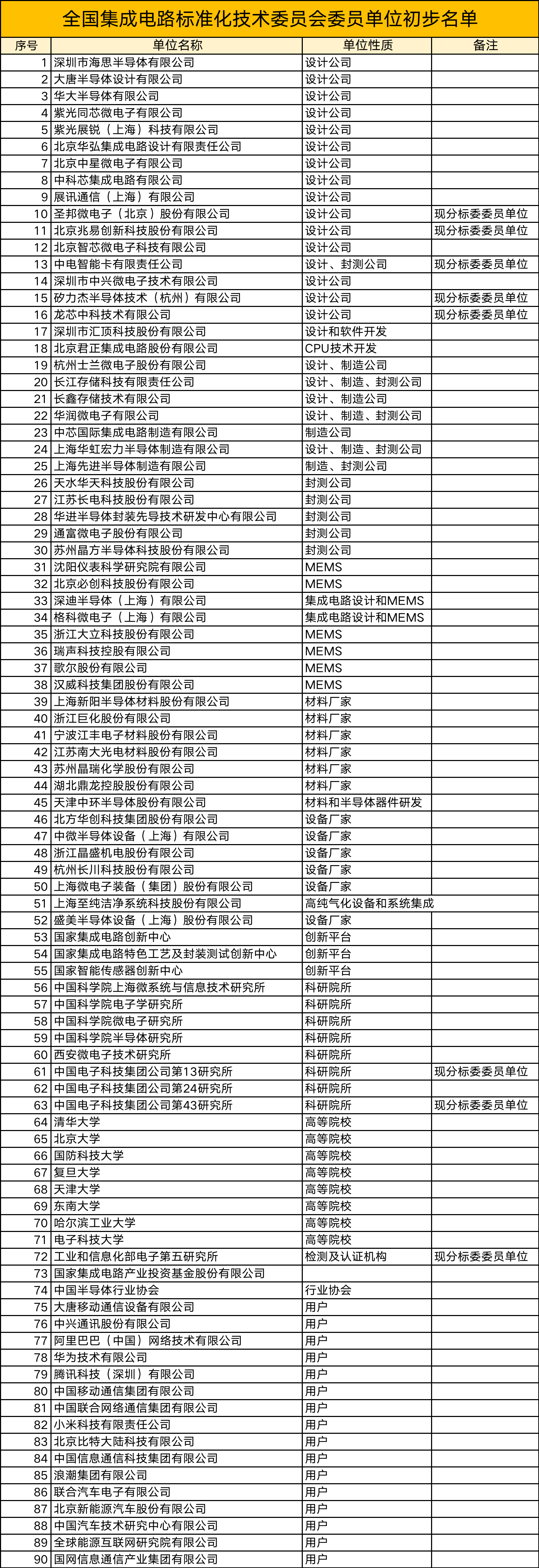全國(guó)集成電路標(biāo)準(zhǔn)化技術(shù)委員會(huì)(以下簡(jiǎn)稱“標(biāo)委會(huì)”)成立大會(huì)暨一屆一次全體委員會(huì)議4月6日在京召開。會(huì)議宣布了集成電路標(biāo)委會(huì)委員名單,目前,官方尚未公布標(biāo)委會(huì)名單,2021年工信部曾公開籌建名單(見下圖)。對(duì)外公開的委員單位包括漢威科技、沈陽儀表院等90家。