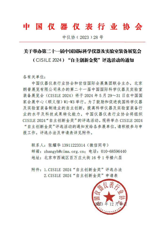 中國儀器儀表行業(yè)協(xié)會和世信國際會展集團(tuán)聯(lián)合主辦,北京朗普展覽有限公司承辦的第二十一屆中國國際科學(xué)儀器及實驗室裝備展覽會(CISILE 2024)將于2024年5月29~31日在中國國家會展中心(順義館)W1-W3舉行。為了鼓勵和促進(jìn)我國科學(xué)儀器及實驗室裝備制造業(yè)的自主創(chuàng)新,提高科學(xué)儀器及實驗室裝備行業(yè)的水平及科技成果轉(zhuǎn)化能力,中國儀器儀表行業(yè)協(xié)會將組織CISILE 2024“自主創(chuàng)新金獎”的評選活動。現(xiàn)將舉辦CISILE 2024“自主創(chuàng)新金獎”評選活動的通知發(fā)給各參展單位,請積極參與申報工作。評選辦法及申請表詳見附件。