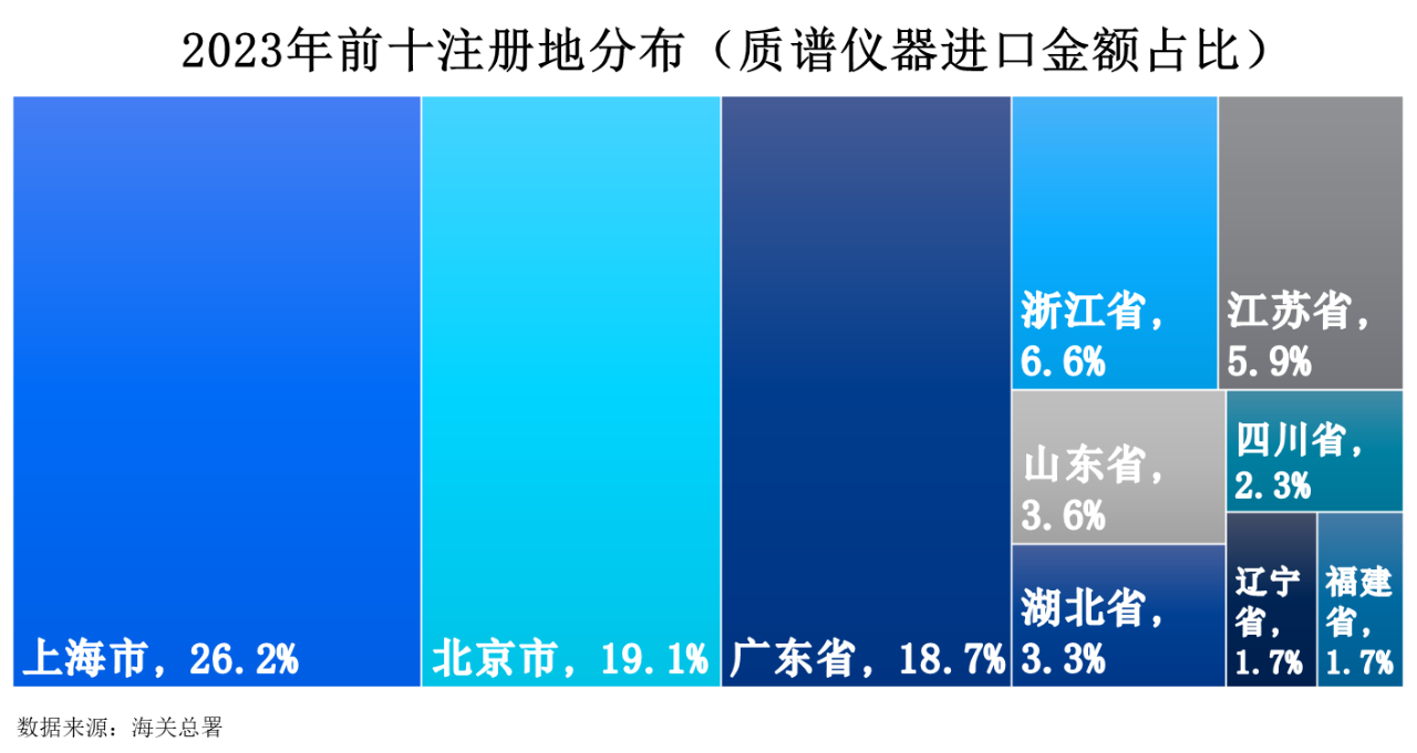 2023年質譜儀器進口額前十注冊地分別為上海市、北京市、廣東省、浙江省、江蘇省、山東省、湖北省、四川省、遼寧省以及福建省,占比分別為26.2%、19.1%、18.7%、6.6%、5.9%、3.6%、3.3%、2.3%、1.7%以及1.7%。