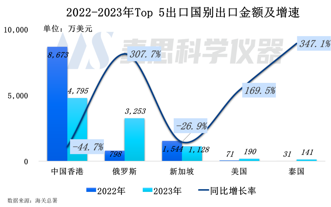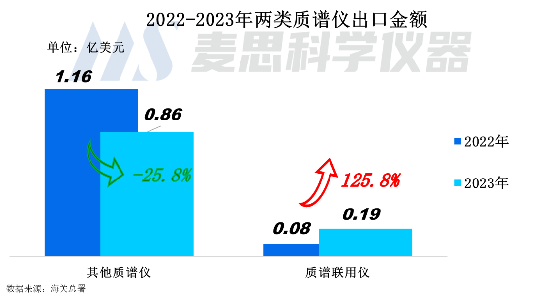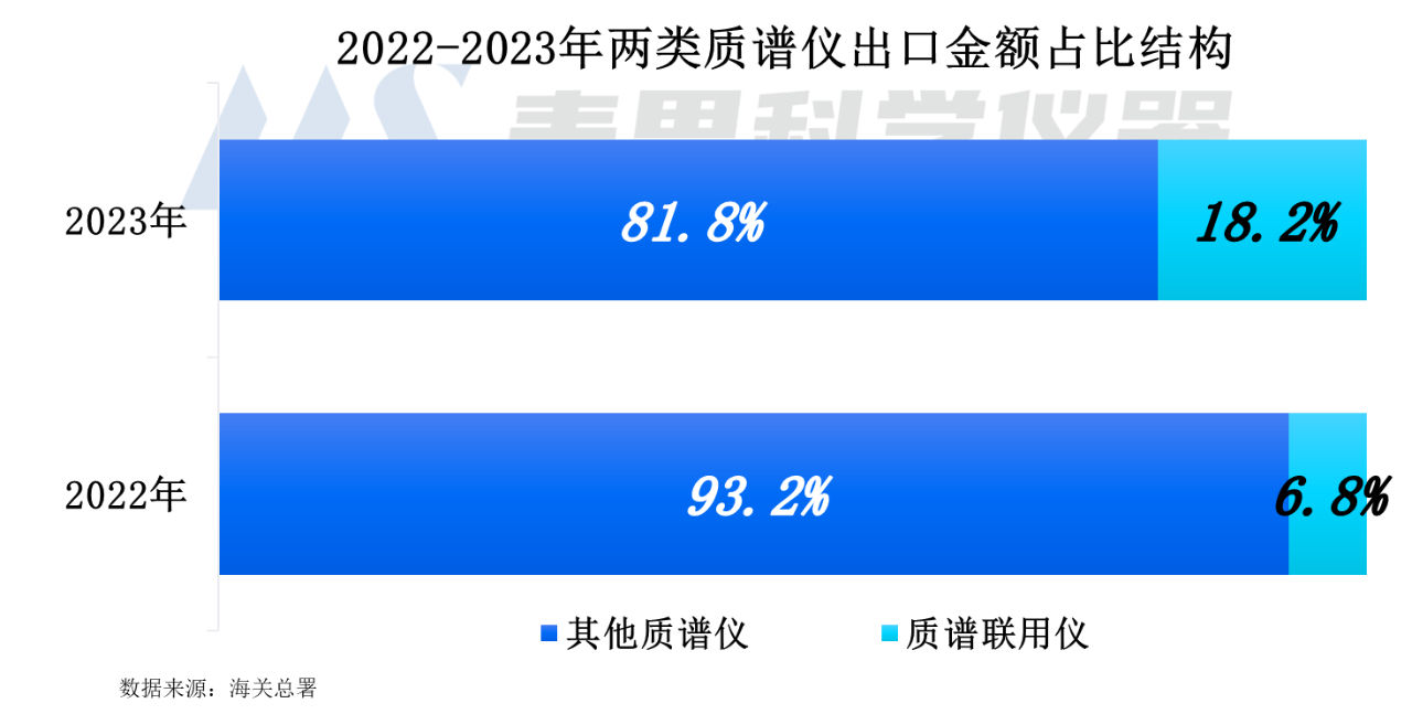 質譜聯用儀的需求大幅增加。2023年質譜聯用儀出口金額為1900萬美元,較2022年增長125.8%。質譜聯用儀的出口金額占比增至18.2%,同比增加11.4個百分點。