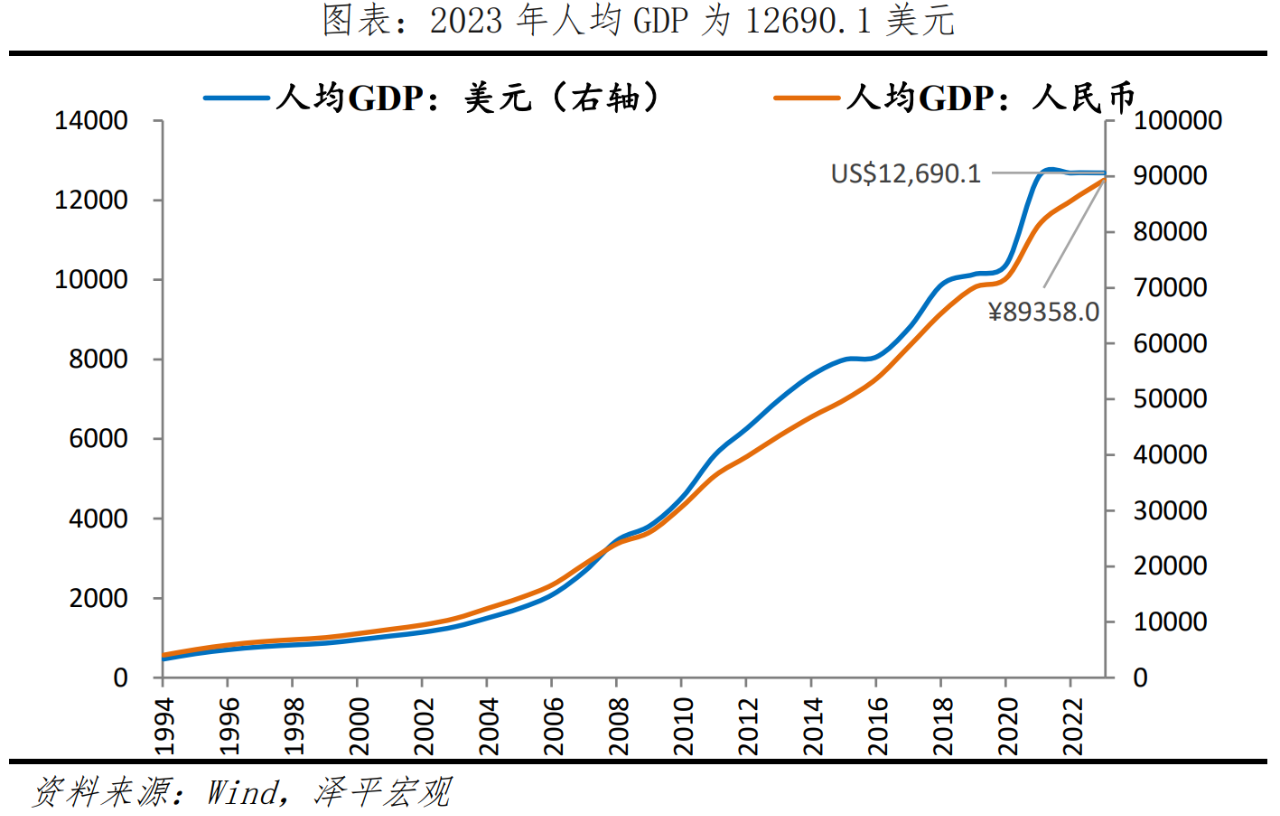 我國已接近高收入國家標準,但距離2萬美元的發達國家門檻仍有一段距離。2023年人均GDP為89358.0元,名義增長5.4%,較上年增速擴大2.4個百分點;全員勞動生產率為161615元/人,比上年提高5.7%。按世界銀行標準,高收入國家人均GNI門檻約為13845美元。以美元計價,我國2023年人均GDP為12690.1美元,人均GNI為12596.6美元,接近高收入國家門檻。