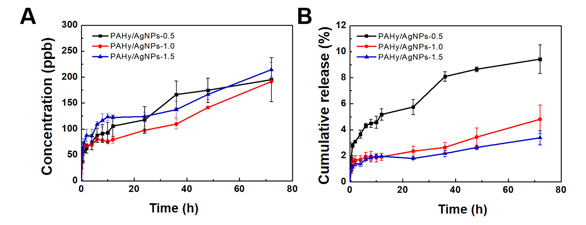 The release behavior of silver from the three different PAHy/AgNPs nanofiber hydrogel mats.