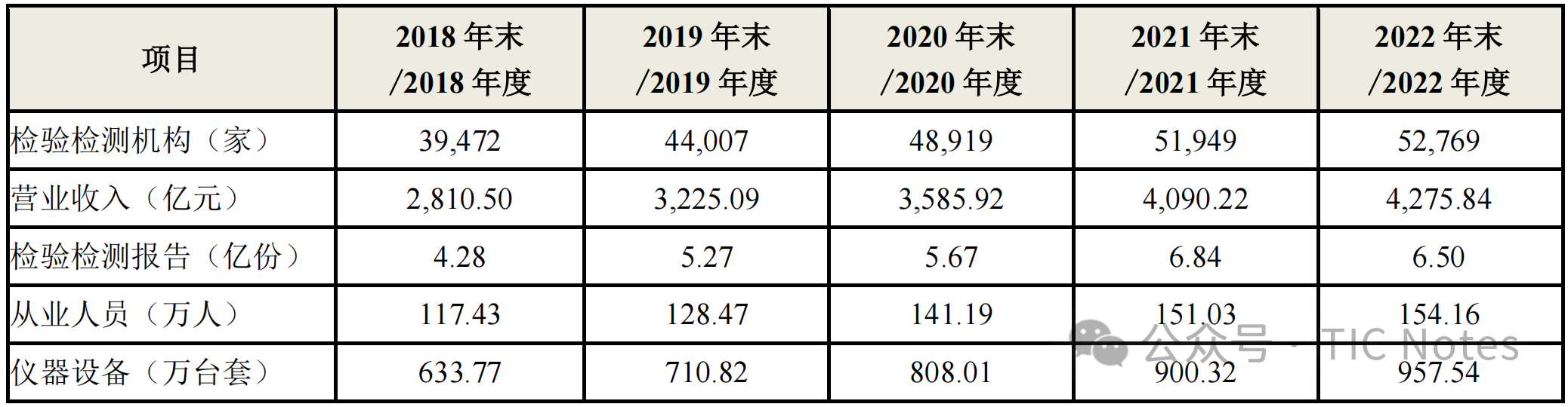我國檢驗檢測服務(wù)業(yè)現(xiàn)已覆蓋建筑工程、環(huán)保、衛(wèi)生、農(nóng)業(yè)、質(zhì)檢、食品、藥品、機械、電子、輕工、紡織、航空等國民經(jīng)濟各個領(lǐng)域,根據(jù)國家市場監(jiān)督管理總局于 2023 年 6 月發(fā)布的《2022 年度全國檢驗檢測服務(wù)業(yè)統(tǒng)計簡報》(以下簡稱“統(tǒng)計簡報”),我國檢驗檢測行業(yè)規(guī)模繼續(xù)擴大;2022 年末,獲得資質(zhì)認定的各類檢驗檢測機構(gòu) 52,769 家,較 2021 年末增長 1.58%;2022 年度實現(xiàn)營業(yè)收入 4,275.84 億元,較 2021 年度增長 4.54%;2022 年度共向社會出具檢驗檢測報告 6.50 億份,較 2021 年度下降 4.97% 。